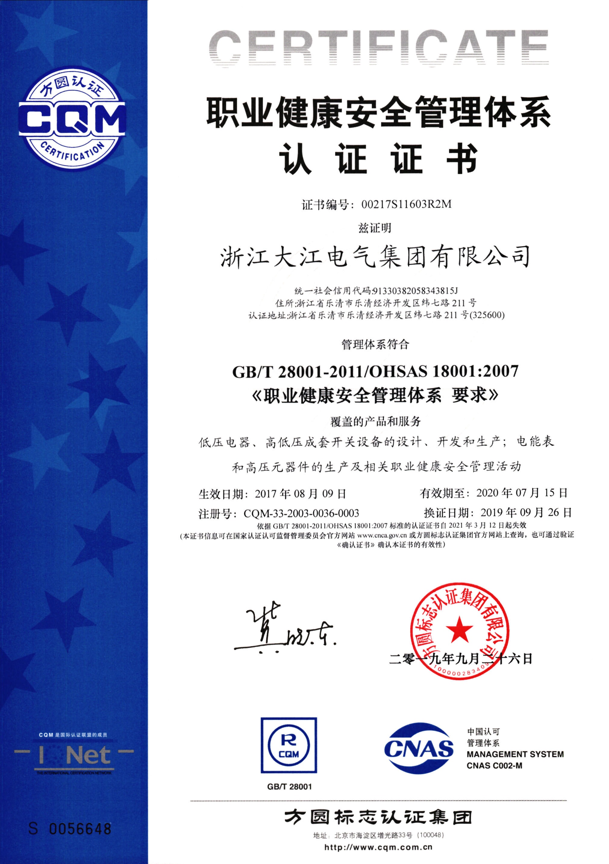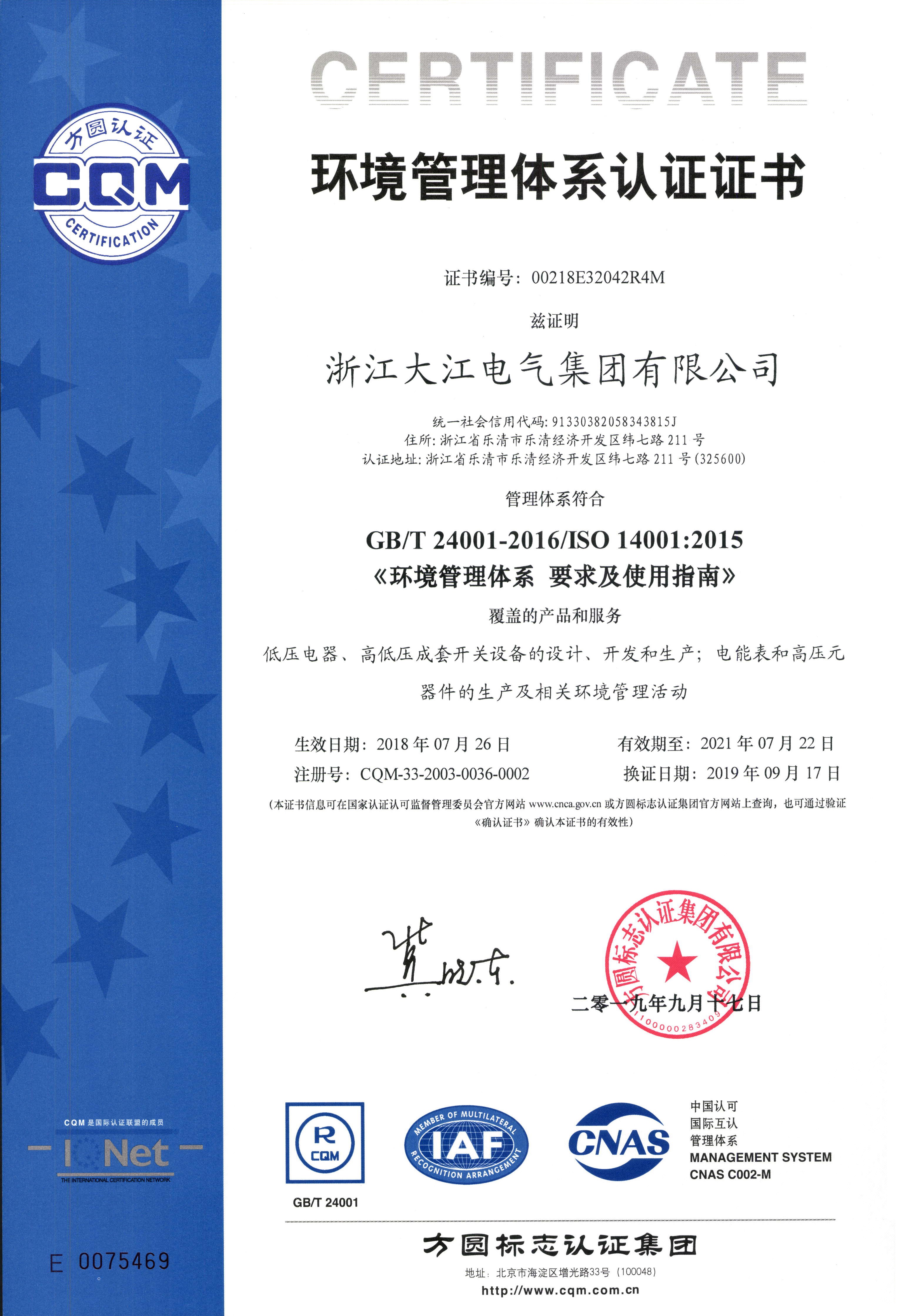 環(huán)境管理體系認證證書
