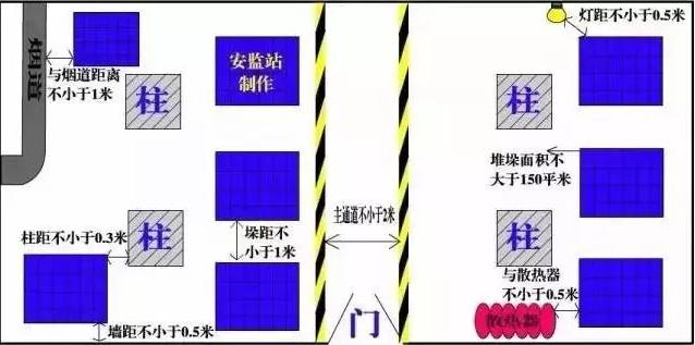 儲存物品與風(fēng)管、供暖管道、散熱器的距離不應(yīng)小于0.5米。與供暖機組、風(fēng)管爐、煙道之間的距離在各個方向上都不應(yīng)小于1米。《倉儲場所消防安全管理通則》(GA1131-2014)6.14