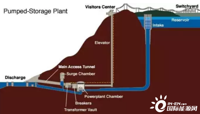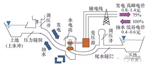 電網(wǎng)低谷時利用過剩電力將作為液態(tài)能量媒體的水從低標(biāo)高的水庫抽到高標(biāo)高的水庫,電網(wǎng)峰荷時高標(biāo)高水庫中的水回流到下水庫推動水輪機(jī)發(fā)電機(jī)發(fā)電。