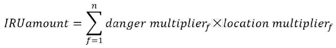 定義綜合指標(biāo)火災(zāi)風(fēng)險(xiǎn)單元(ignition risk unit,IRU)。每次火災(zāi)的具體考核中,加入“地理分布因子Location multiplier”和“火災(zāi)危險(xiǎn)等級(jí)因子danger multiplier”,計(jì)算公式為: