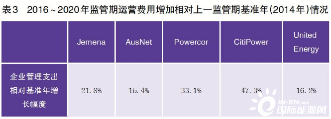 加強(qiáng)輸電設(shè)備防山火管理,也增加了各配電公司的運(yùn)營費(fèi)用支出。維多利亞州5家配電公司2016~2020年監(jiān)管期運(yùn)營費(fèi)用增加相對(duì)上一監(jiān)管期基準(zhǔn)年(2014年)情況見表3。增加原因除了勞動(dòng)力成本的上漲外,主要就是履行防山火義務(wù)增加的運(yùn)營費(fèi)用。