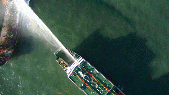舟山隊“中化應(yīng)急”號救援船撲救著火油船