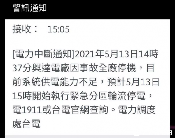 據(jù)報道,高雄市今天下午近3時,多個行政區(qū)出現(xiàn)大停電現(xiàn)象,網(wǎng)友抱怨今天天氣30多度,冷氣停電熱到爆。稍早媒體收到“警訊通知”短信,上面寫著“5月13日14時37分興達電廠因事故全廠停機,目前系統(tǒng)供電能力不足,預計5月13日15時開始執(zhí)行緊急分區(qū)輪流停電”。臺電高雄區(qū)處則說,目前正在了解厘清。