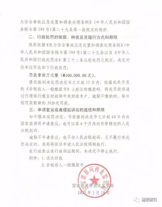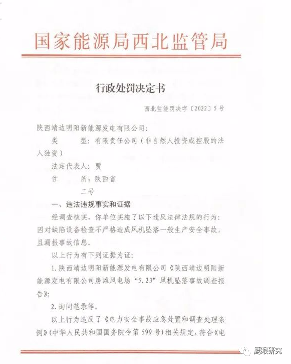 3月18日,國家能源局西北監(jiān)管局發(fā)布對陜西靖邊明陽新能源發(fā)電有限公司的行政處罰決定書(西北監(jiān)能罰決字〔2022〕5號),該公司因?qū)θ毕菰O備檢查不嚴格造成風機墜落一般生產(chǎn)安全事故,且漏報事故信息,對其作出罰款10萬元的決定。