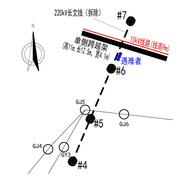 2023 年5月8日,施工項(xiàng)目部安排施工人員在原 220 千伏長(zhǎng)文線 6-7 號(hào)桿塔間進(jìn)行10千伏夏屯線跨越架搭設(shè),因民事阻工僅在事故發(fā)生處南側(cè)搭設(shè)了單側(cè)跨越架。
