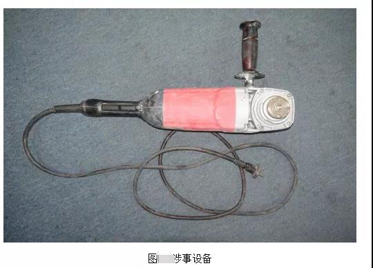 涉事設(shè)備產(chǎn)品名稱為角向磨光機(jī),所有人:彭小共,型號(hào):S1M-HL02B-180,電源電壓:220V-50Hz,額定空載轉(zhuǎn)速:8400r/min,功率:2600W,砂輪外徑:φ180mm,生產(chǎn)單位:蘇州聚匠人五金工具有限公司,銘牌處還有閱讀說明書提示標(biāo)識(shí)和佩戴護(hù)目鏡提示標(biāo)識(shí),測得涉事設(shè)備的砂輪片安裝軸直徑為φ25.4mm。涉事設(shè)備的前端部位為金屬材質(zhì),其余部位均為塑料材質(zhì)。