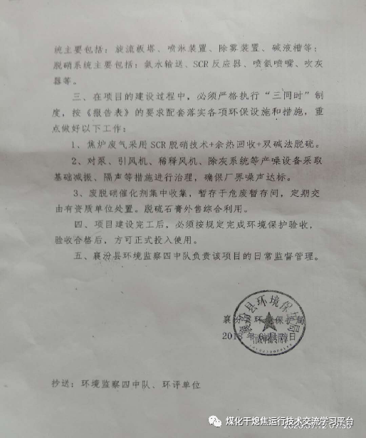 1)濕法脫硫系統(tǒng)由青島博利爾電力環(huán)保設備有限公司設計、施工,建設時間為2015年6月。2)脫硝系統(tǒng)由山西長林能源科技有限公司設計、施工,建設時間為2017年5月。3)半干法脫硫系統(tǒng)由北京晨曦環(huán)保有限公司設計、施工,建設時間為2018年6月。原襄汾縣環(huán)境保護局2018年6月7日出具了《關于山西省襄汾縣宏源煤焦化工有限公司一車間、二車間焦化項目焦爐尾氣脫硫、脫硝綜合改造工程建設項目環(huán)境影響報告表的審批意見》(襄環(huán)審函〔2018〕56號)。4)宏源煤焦化工有限公司一車間、二車間焦化項目焦爐尾氣脫硫、脫硝綜合改造工程工藝簡介:本項目采用的是先脫硝后脫硫工藝,脫硝系統(tǒng)為中低溫SCR脫硝工藝,脫硝效率86%,一爐配一套SCR反應器,氨水來自于焦化廠區(qū)內氨水管網(wǎng),焦爐煙氣脫硫系統(tǒng)采用雙堿法脫硫工藝,脫硫效率為80%,具體設備設施包括:中低溫SCR脫硝裝置、余熱回收裝置、濕電除塵裝置等。