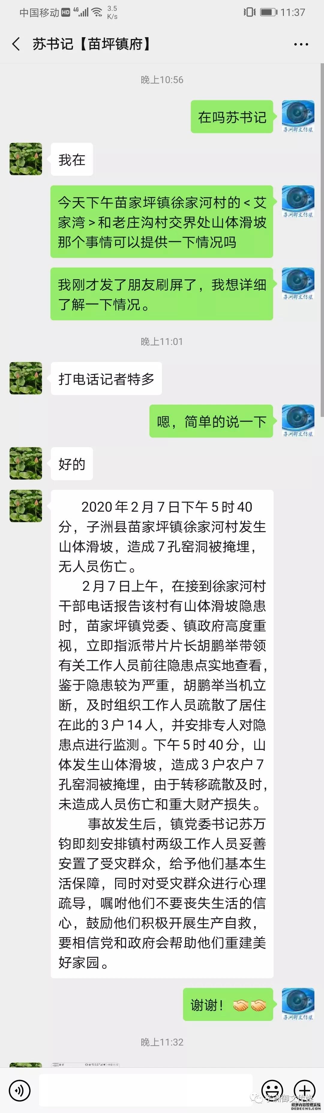 2月7日上午,在接到徐家河村干部電話報(bào)告該村有山體滑坡隱患時,苗家坪鎮(zhèn)黨委、鎮(zhèn)政府高度重視,立即指派帶片片長胡鵬舉帶領(lǐng)有關(guān)工作人員前往隱患點(diǎn)實(shí)地查看,鑒于隱患較為嚴(yán)重,胡鵬舉當(dāng)機(jī)立斷,及時組織工作人員疏散了居住在此的3戶14人,并安排專人對隱患點(diǎn)進(jìn)行監(jiān)測。下午5時40分,山體發(fā)生山體滑坡,造成3戶農(nóng)戶7孔窯洞被掩埋,由于轉(zhuǎn)移疏散及時,未造成人員傷亡和重大財(cái)產(chǎn)損失。