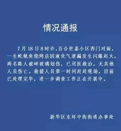 據(jù)通報顯示,7月18日上午8時左右,百合世嘉小區(qū)西門對面,一生蠔魷魚燒烤店因液化氣泄漏發(fā)生閃爆起火。