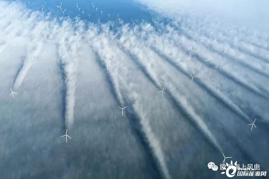 Horns Rev 1是全球第一座商業(yè)化規(guī)模的海上風(fēng)場,最早由沃旭開發(fā),安裝了80臺(tái)2MW Vestas風(fēng)機(jī),葉輪直徑80米,輪轂高度80米,總裝機(jī)160MW。場址所在位置風(fēng)功率密度398W / m2,最遠(yuǎn)離岸距離18公里,最大水深14米。下圖這張顯示風(fēng)機(jī)尾流影響的著名照片就來自于這座風(fēng)場。