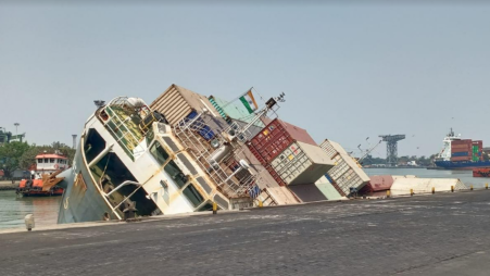 加爾各答港口官員報(bào)告說,這艘船于3月22日從印度薩加爾港抵達(dá)加爾各答,在3月24日上午剛剛完成裝載,總共裝載了165 個(gè)集裝箱,包括120個(gè) 20 英尺集裝箱和45 個(gè) 40英尺集裝箱。該船原定于今天啟程前往孟加拉國吉大港,然而突然在沒有任何征兆的情況下發(fā)生傾斜,并在15分鐘內(nèi)側(cè)翻和部分沉沒,導(dǎo)致集裝箱掉入港口。