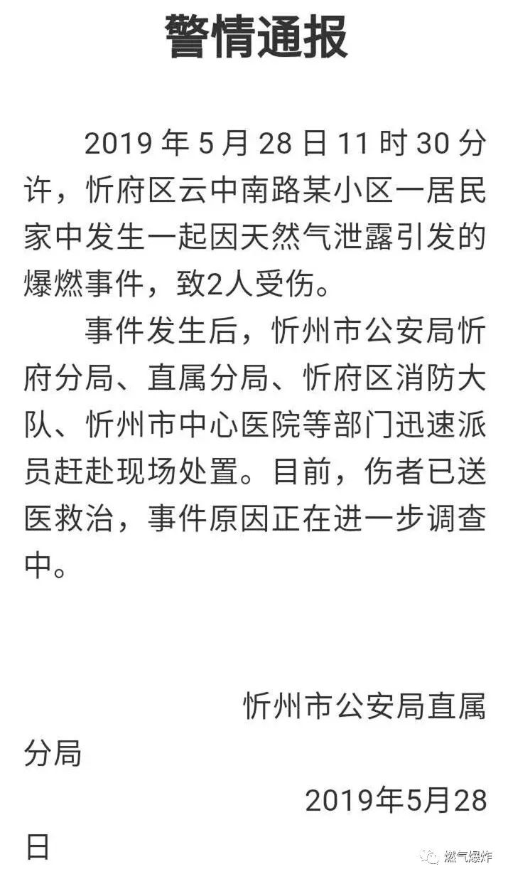 月28日11時30分許,忻府區(qū)云中南路某小區(qū)一居民家中發(fā)生一起因天然氣泄漏引發(fā)的爆燃事件,致2人受傷。