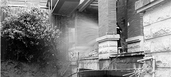 消火栓取水時,新的問題出現(xiàn)了。“消防栓在一處花欄墻附近,出水口緊貼著墻面,根本就沒辦法用?!睘榱瞬坏⒄`救援工作,消防官兵立即用器材對消火栓周邊墻壁進行處置,留出足夠的空間供水帶取水。