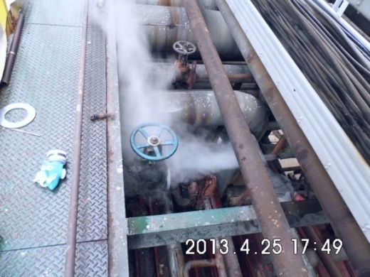 由于“沈陽蠟化”氣分裝置脫丙烷塔頂冷凝器E9003及脫乙烷塔頂冷凝器E9006內(nèi)漏,烴類物料竄入循環(huán)水中,污染循環(huán)水水質(zhì)又造成裝置收率下降,于4月24日按照局部停工方案退出物料,并在吹掃、置換系統(tǒng)后由“十三化建”搶修、更換換熱器管束。